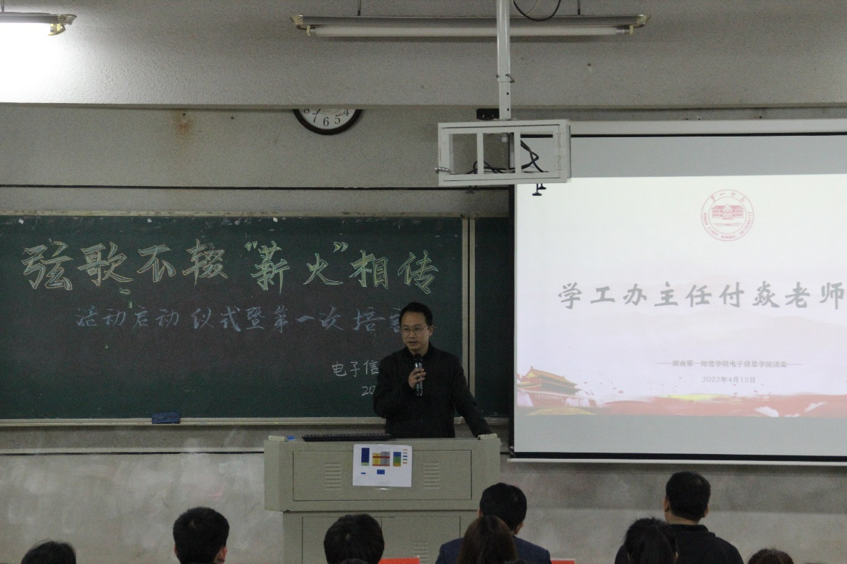 随后,付焱老师从此次培训的重要性、战略意义上对“薪火”培养工程表达了充分的肯定,并参与培训的同学们提出几点要求:一是纪律性、规范性和实效性;二是要内强素质,外树形象;三是要创新开拓,形成工作“宝典”。