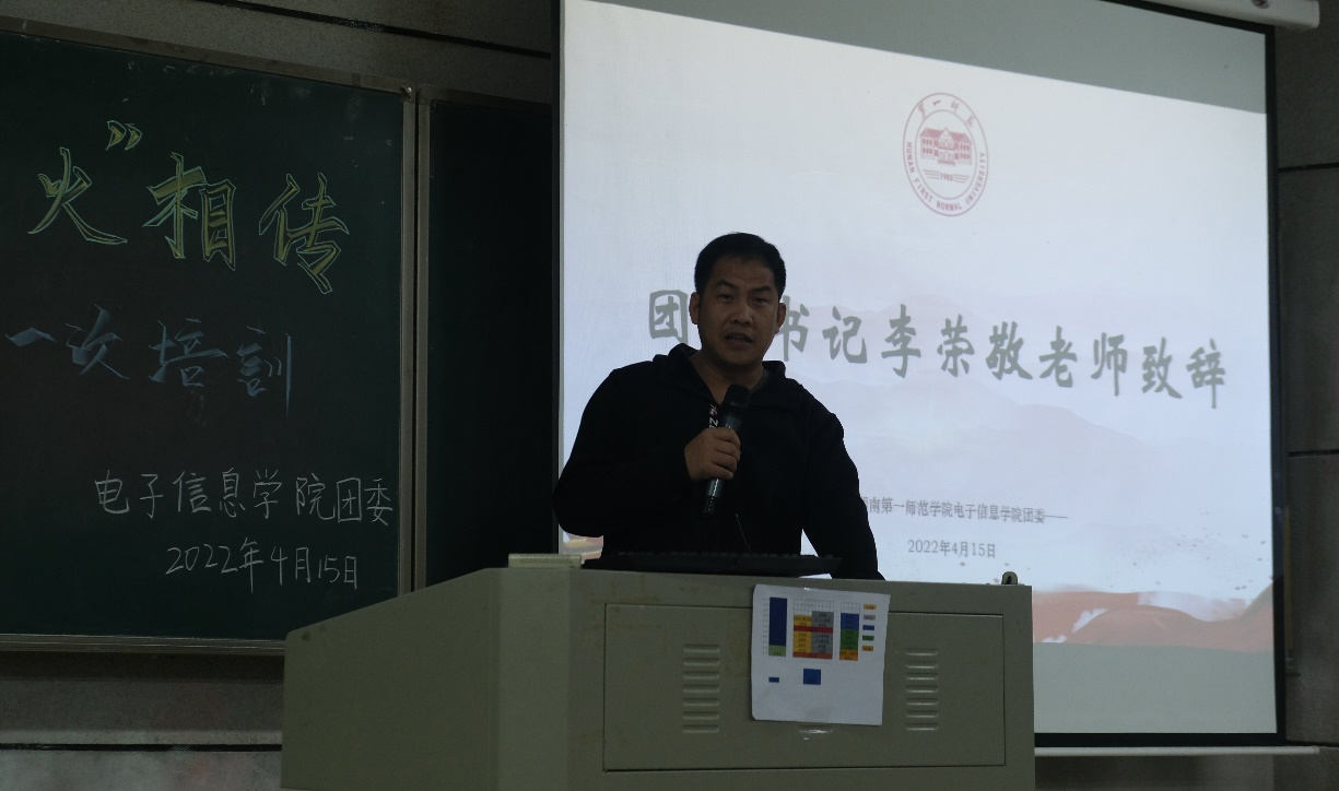 团委副书记李荣敬老师首先致辞,表达了对学生干部的三个希望:一是要善学勤思;二是要学以致用;三是要发挥先锋表率作用,做好学生老师间的桥梁纽带。