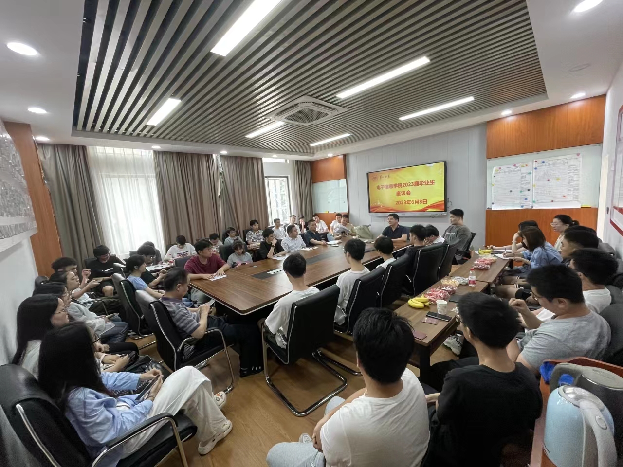 6月8日下午15:00,电信院2023届毕业生座谈会在玉衡楼北栋302召开。学院党委书记吴涛、院长高峰、副院长王建军、院长助理滕书华,教授代表阳西述,学工办主任余亮、毕业班辅导员李荣敬、何忠华,近40名毕业生参加座谈会。会议由李荣敬主持。