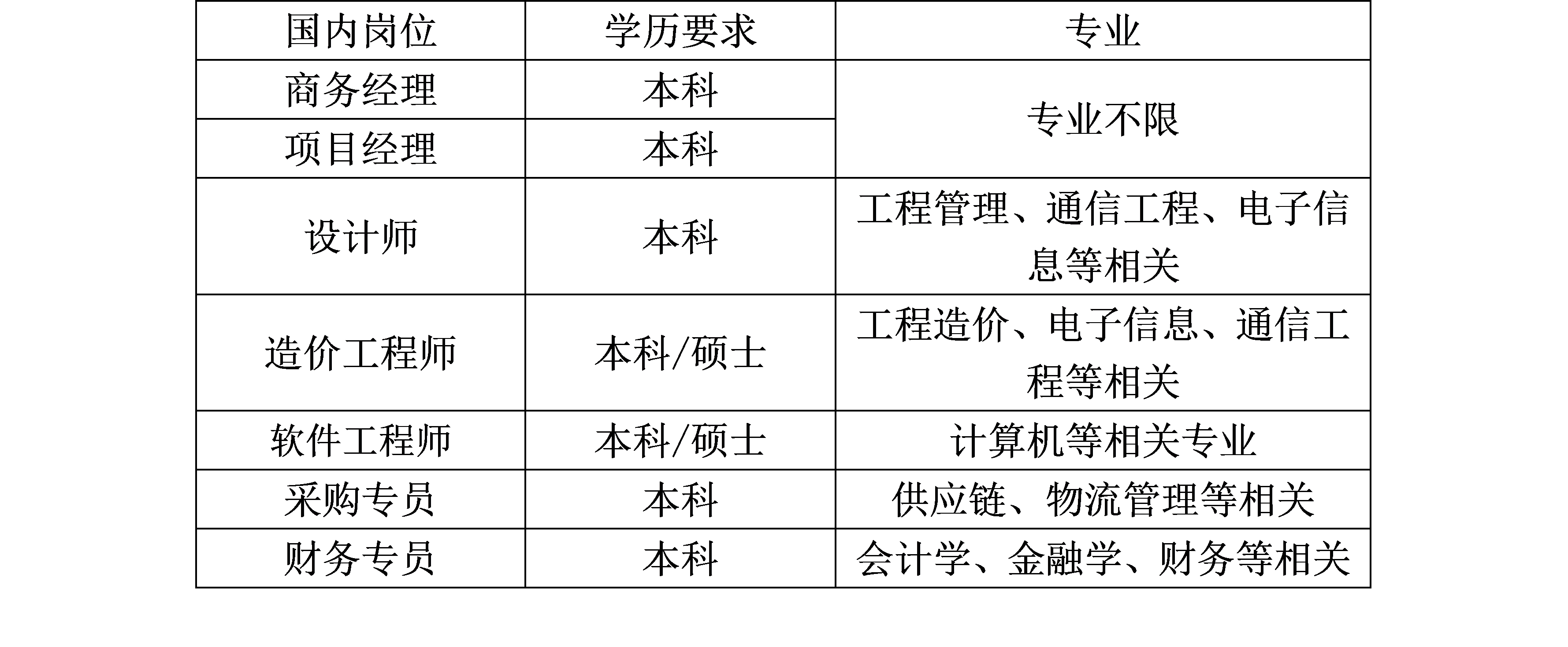 电子信息、计算机、工程管理、电气、暖通、土木、电力、建筑、电气、智能化、供应链、物流管理、会计学、金融学、经济学、财务管理、市场营销(均可放宽)