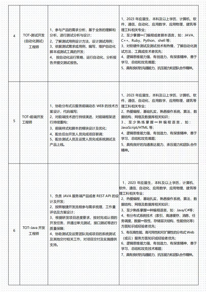 6、工作地点:TOT研发序列bsae北京、上海、西安、广州,EOE销服序列base全国(具体岗位工作城市可在投递时查看);
