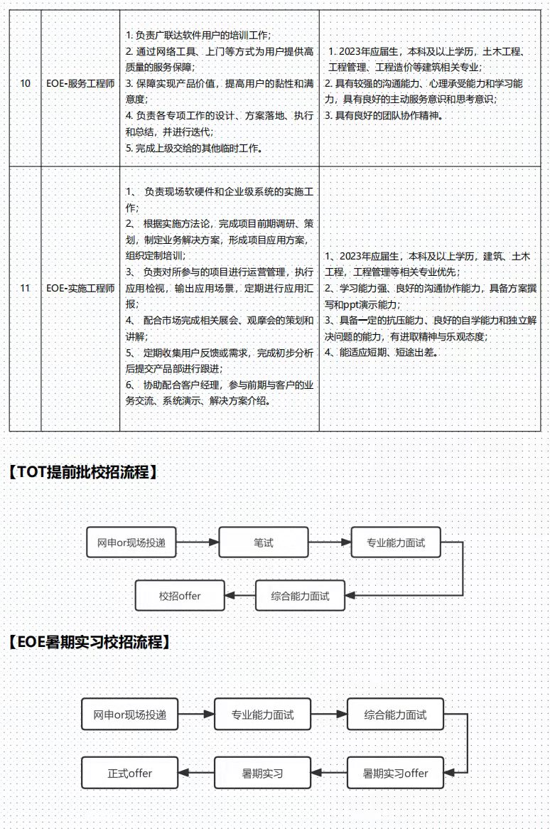 2023届广联达集团春季校园招聘项目于2022年 3月正式启动。广联达集团TOT 研发序列提前批校园招聘包含图形开发工程师、Java开发工程师、产品经理等8种校招岗位,广联达渠道分支EOE 销服序列暑期实习生校园招聘包含销售工程师、服务工程师、实施工程师3种校招岗位。两个序列面向全球2023 届(毕业时间:2022年10月-2023 年7月)本科及以上学历的精英学子发出邀请,欢迎同学们踊跃参与!