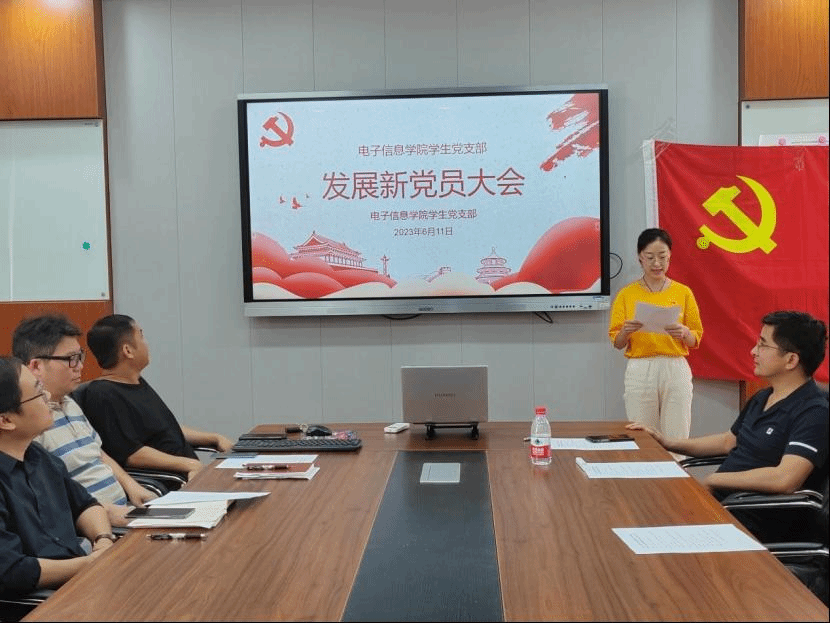 学生党支部于2023年6月11日在玉衡楼北栋302会议室以及线上腾讯会议室组织召开发展新党员大会。电信院党委书记吴涛、学生党支部书记李荣敬、学生党支部组织委员何忠华、学工办主任余亮、学生党员以及发展对象参加本次会议,本次会议由郭跃进同志主持。