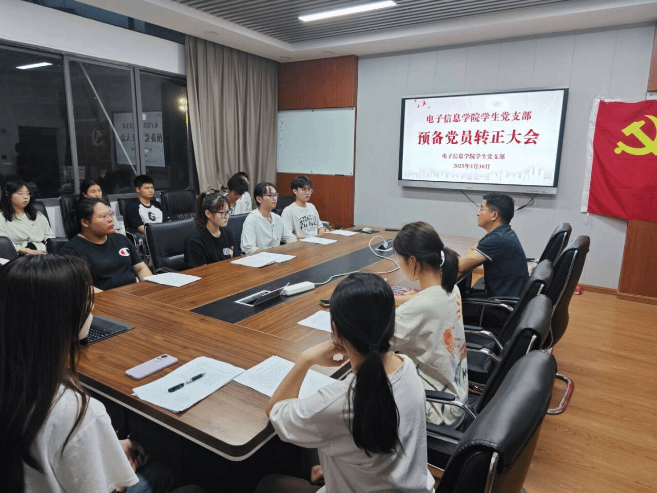 学生党支部于5月26日在玉衡北302和线上会议室召开预备党员转正大会。院党委书记吴涛、学生党支部书记姚瑶、学生党员们参加会议。本次会议由肖文圣主持。