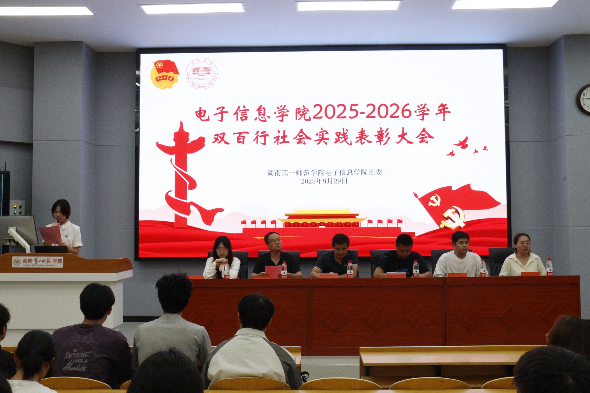 2025-2026学年双百行社会实践表彰大会在润寰南105隆重举行。参加本次大会的人员有院党委书记吴涛、院党委副书记伍雁鹏、学工办主任余亮、分团委书记谭炜、学生党支部书记姚瑶、辅导员宋殿梅、获奖团队及个人,以及百余名学生代表。