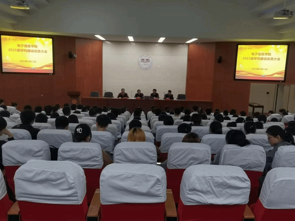 召开2021级全体学生学风建设暨贯彻落实办学新理念宣讲大会。学院院长高峰、党委副书记吴涛、副院长王建军、学工办主任付焱、电子信息系主任潭周文、团委副书记李荣敬以及2021级全体学生参加本次大会。